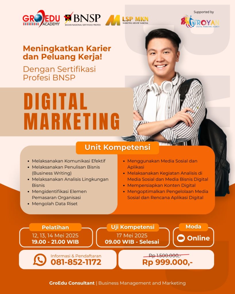 • Ikuti pelatihan sertifikasi profesi Digital Marketing untuk tingkatkan Karier dan Peluang Kerja, silahkan Daftar DI SINI